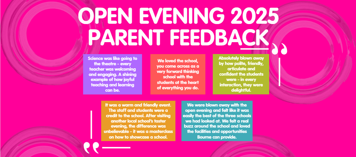 We are delighted to be hosting our next Open Evening Event at The Bourne Academy, allowing us to showcase the school and all fantastic aspects of Academy life, no booking required, all welcome. Principal talks at 6.15pm & 7.15pm